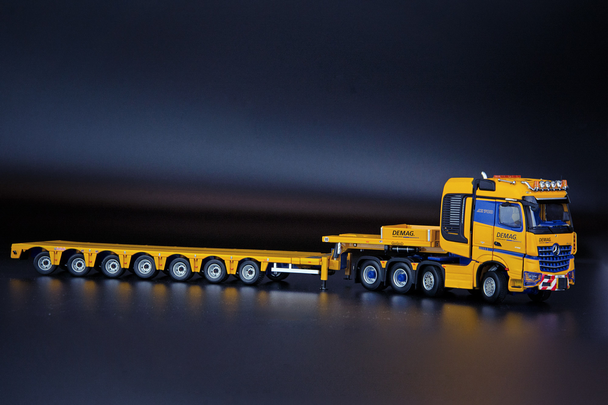 Our die-cast Mercedes-Benz Arocs truck in scale 1:50 comes in a heavy duty SLT configuration. With our Nooteboom MCO Semi Low Loader 7 Axle coupled, this combination is often used to transport crane parts such as ballast, upperstructures, boom sections and other heavy equipment. Both truck and trailer are painted in the official Tadano blue (RAL 5002) en yellow (RAL 1007) and feature anti-scratch coating, high quality pad printing and fine photo-etch material for a detailed model. This series is produced in a limited edition, each model is uniquely numbered at the bottom on a metal plate.
