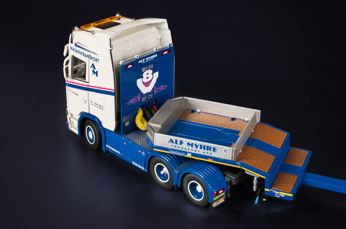 The combination for the Danish Maskin Transport consists of a Scania S series high roof 6x4 and Nooteboom MCOS 4-axle semi low loader with ramps. The high-quality die-cast Scania truck in scale 1:50 has many realistic features, such as the custom storage box at the cabine rear, opening doors and high-quality pad printing.