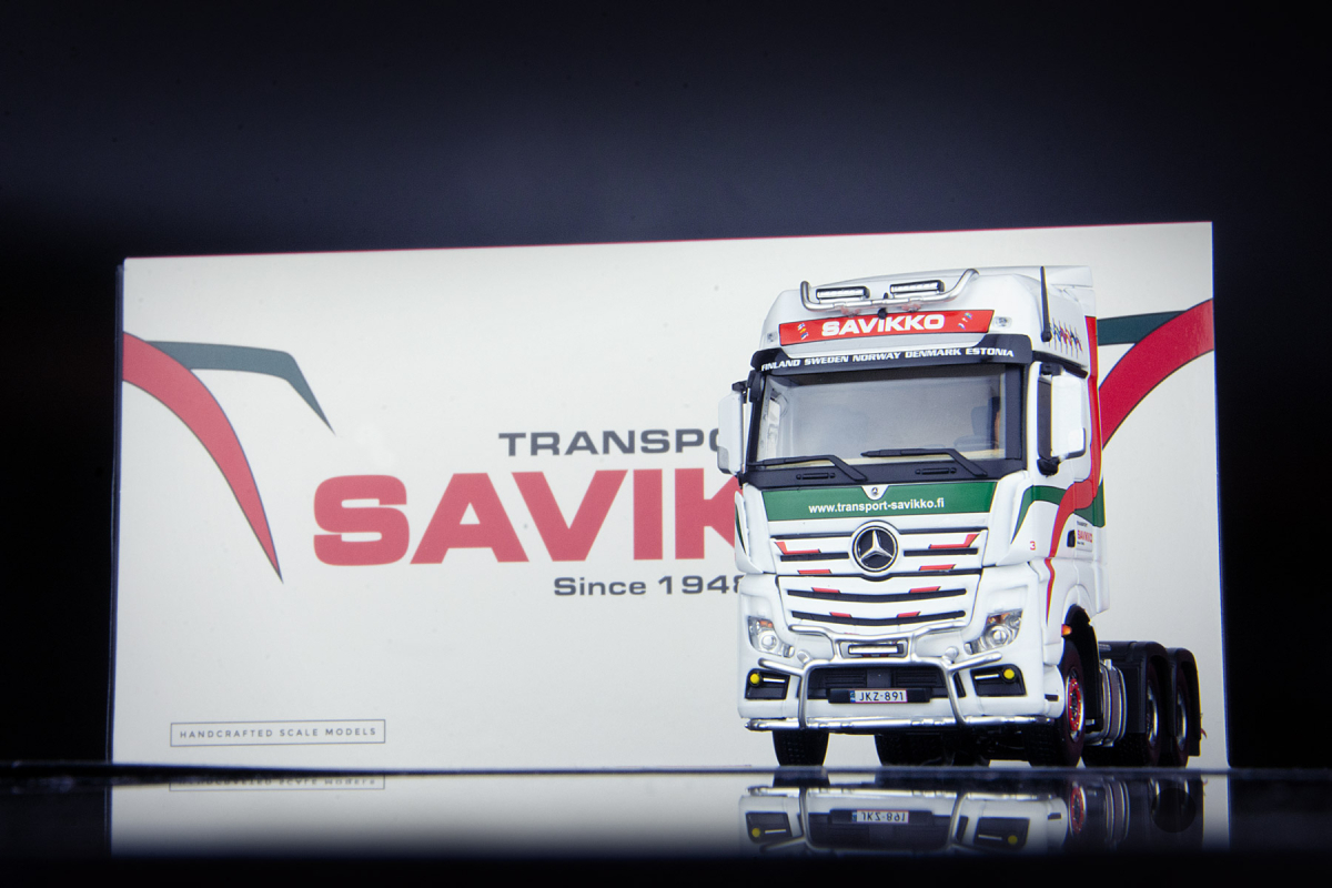 The Mercedes-Benz Actros GigaSpace 6x4 For Savikko. Transport Savikko was founded in 1948 when the brothers Eero and Lauri Savikko started to transport timber. At the beginning of the 21st century, the company’s operations had grown and covered all of the Nordic countries. Transports to Russia and continental Europe were also carried out. Our 1:50 scale model is produced as a limited edition. The Actros comes with open doors, metallic certificate, Savikko packaging, unique lightbar and a custom bull bar.