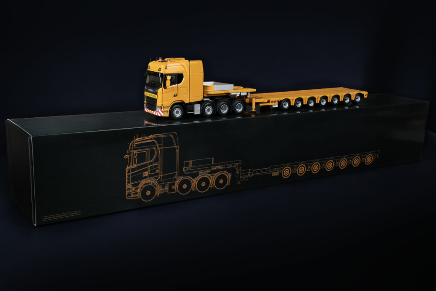 Scania S series High Roof 8x4 with Nooteboom MCOS 7-axle semi low loader